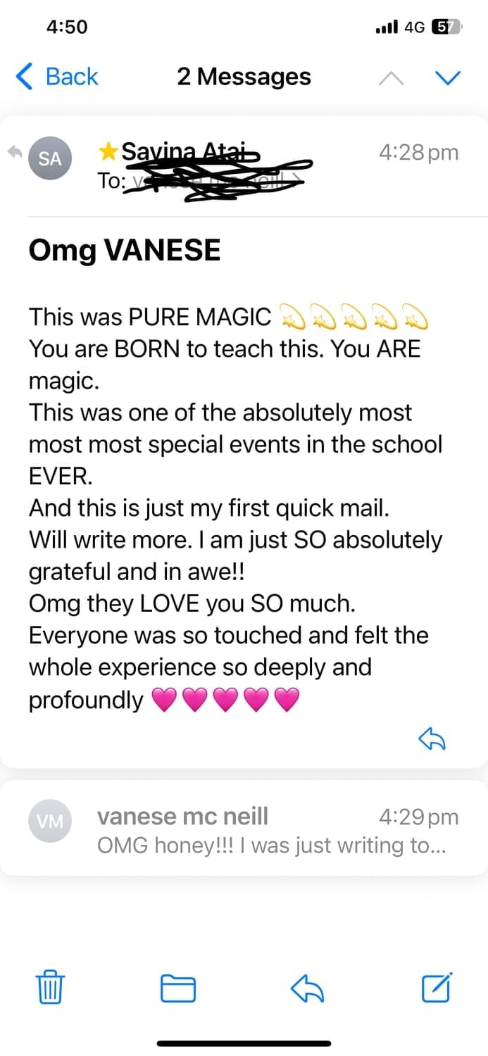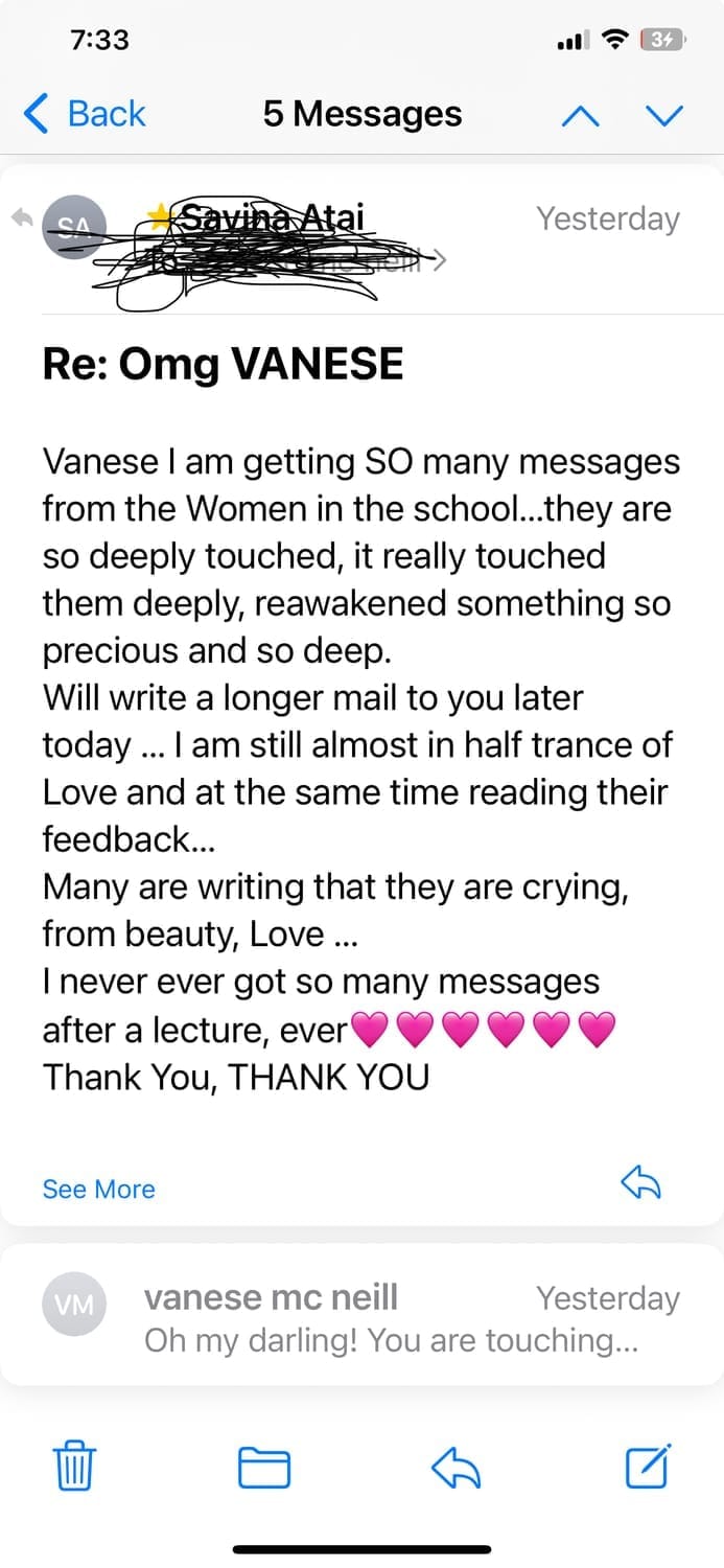 Vanese recently produced an event for Savina Atai and her school, Elixir Wisdom, in Europe, bringing together 2,000 women.